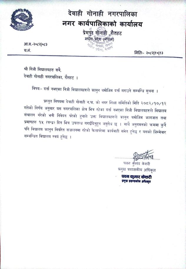 दर्ता नभएका निजी विद्यालयहरुले कानुन बमोजिम दर्ता गराउने सम्बन्धि सुचान ।